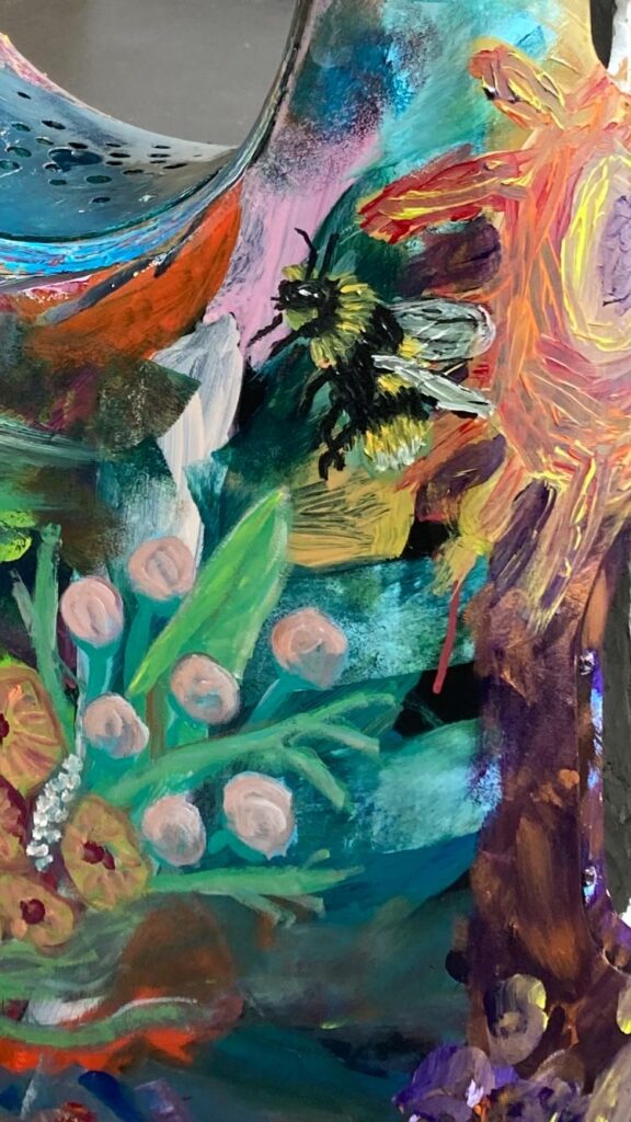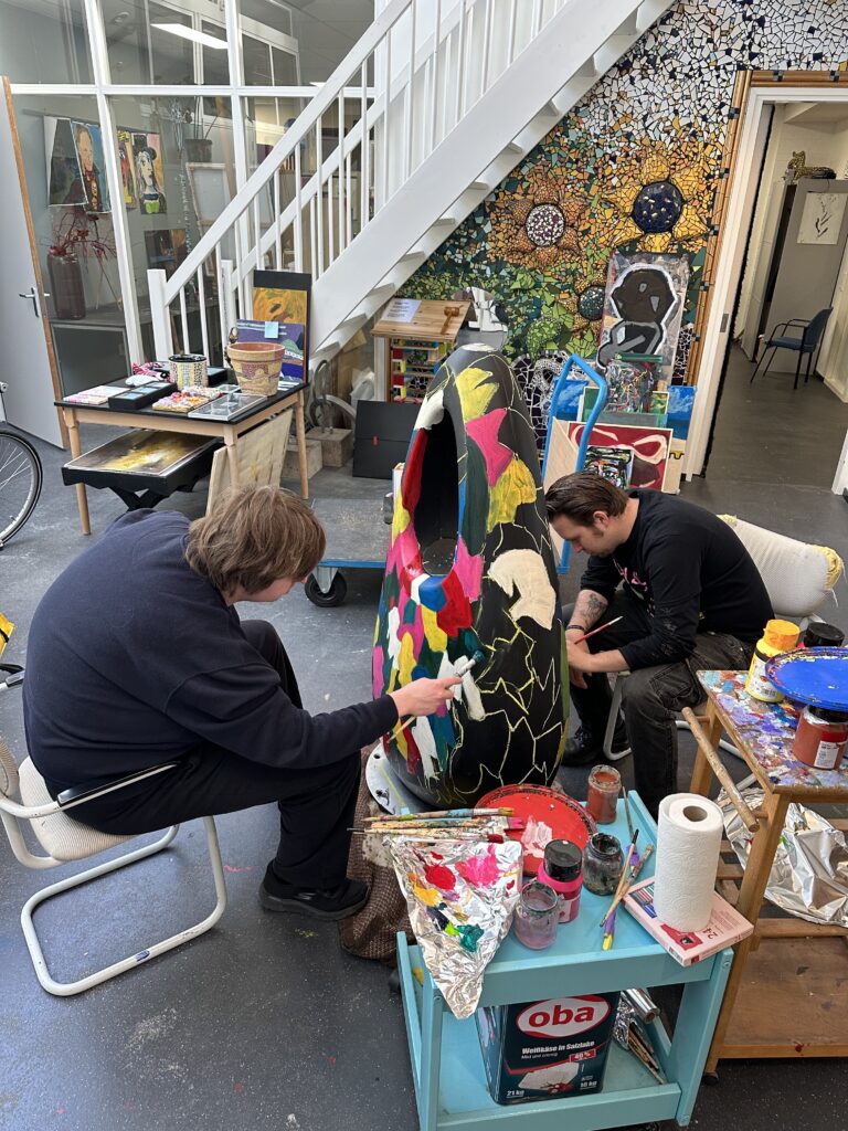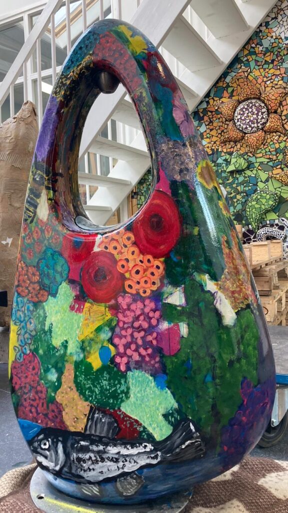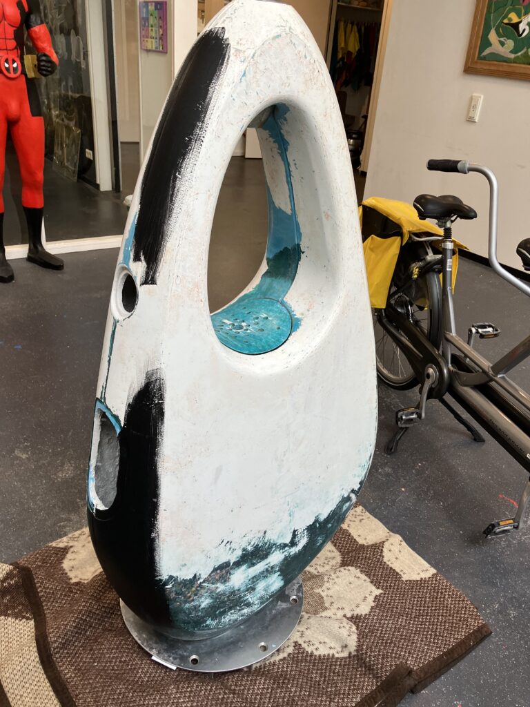 De O-fontein die we een aantal jaren geleden mochten beschilderen was inmiddels op een opslagterrein van de gemeente beland… fors beschadigd!