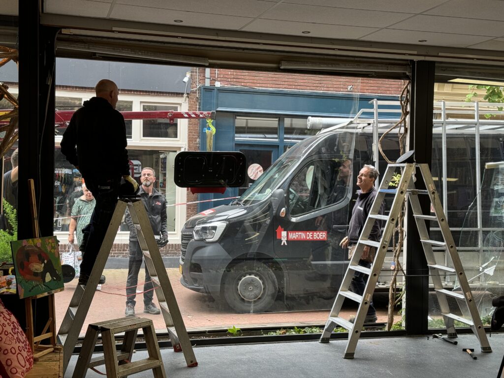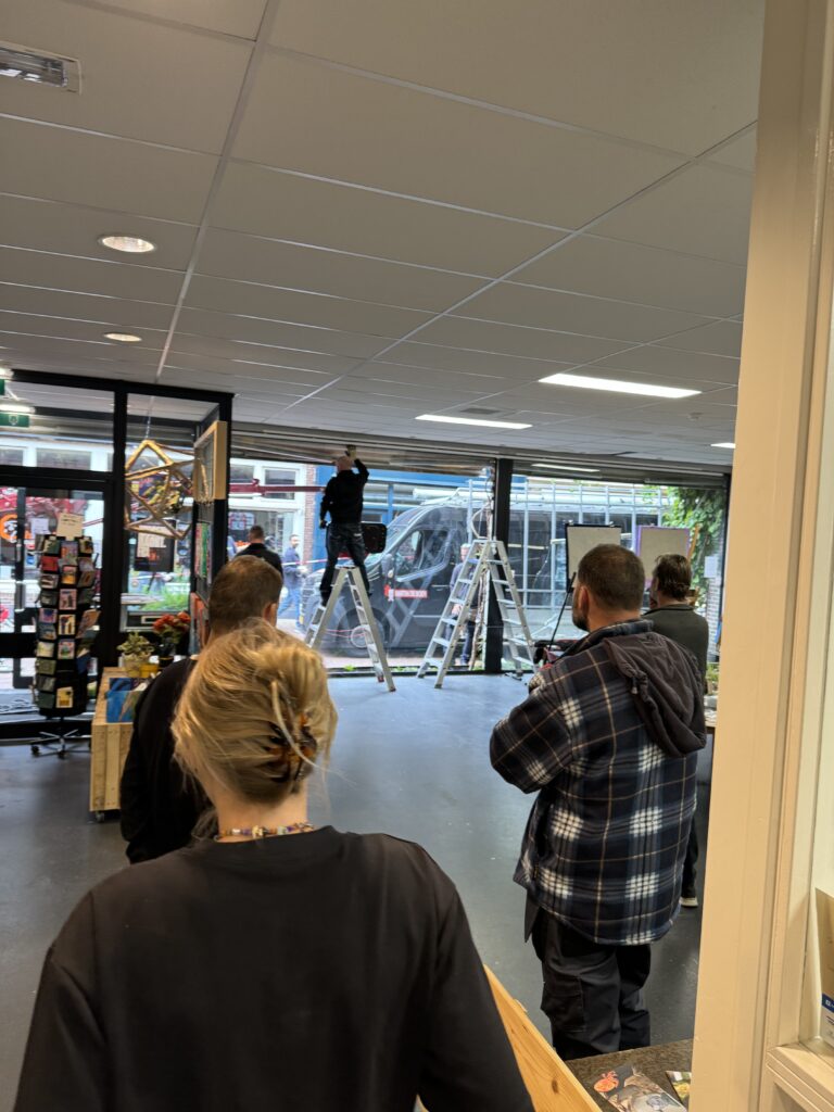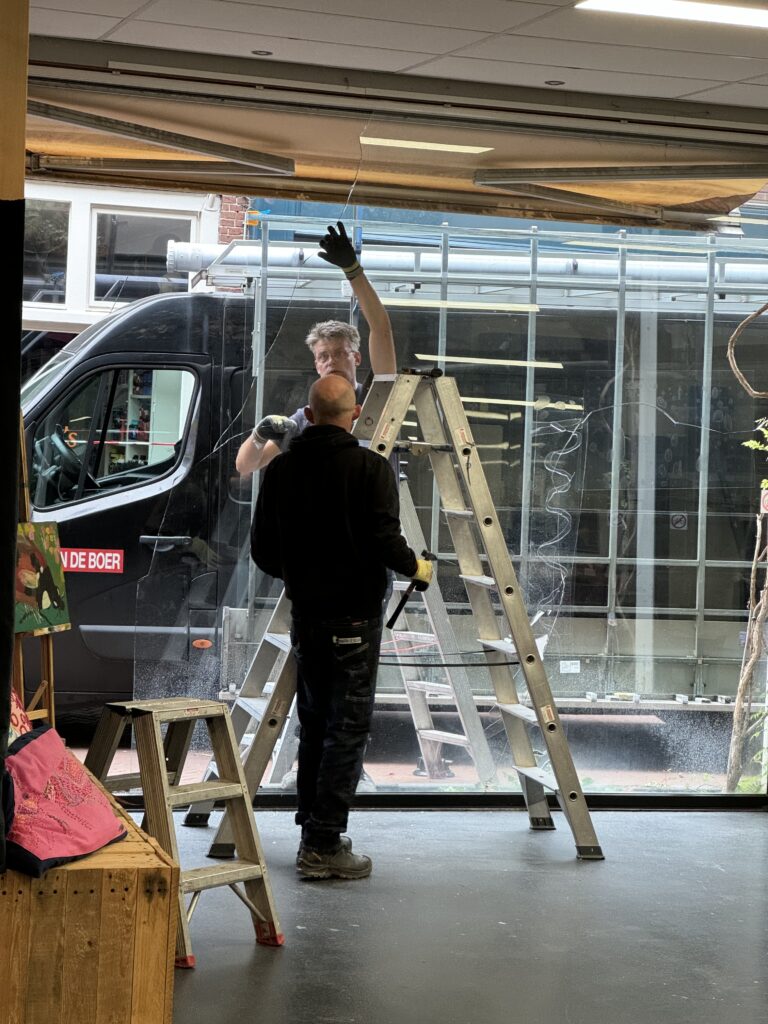 Nieuwe dag gepland om een etalageruit te plaatsen. Ja, het oude zit er nog in (gelukkig).