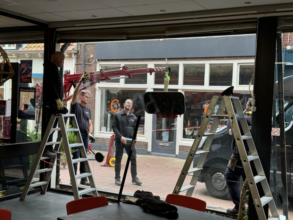 Na de vakantie komen ze meteen langs, 5 man sterk met een kraan en een heel groot raam. Maar niet groot genoeg!