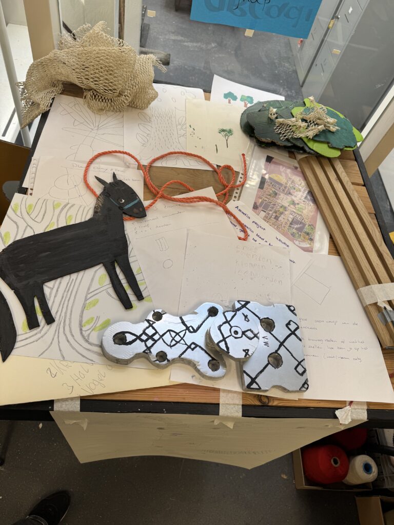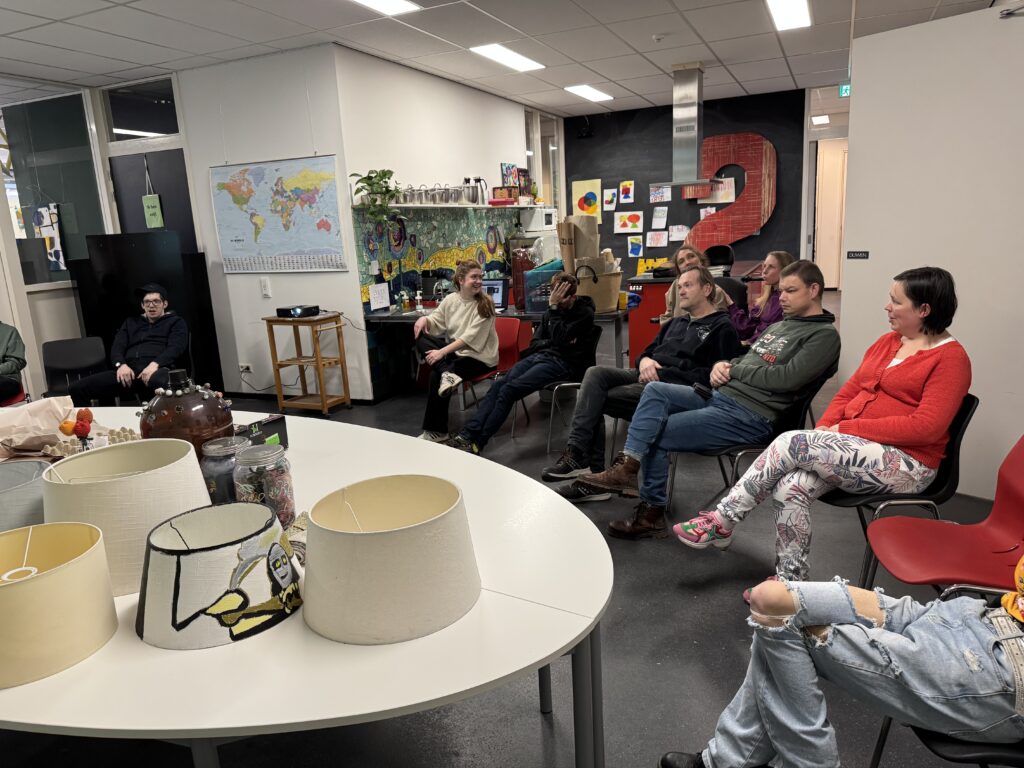 De lampenkappen hebben we samen met vormgeefster Juliet Ypma gemaakt. Zij verzorgde eerst twee informatieve workshops. Daarna zijn we aan de slag gegaan met de uitdaging, hergebruikte en natuurlijke producten gebruiken. Zo weinig mogelijk lijm en geen verf.. maar wel een stevige constructie en artistiek verantwoord!