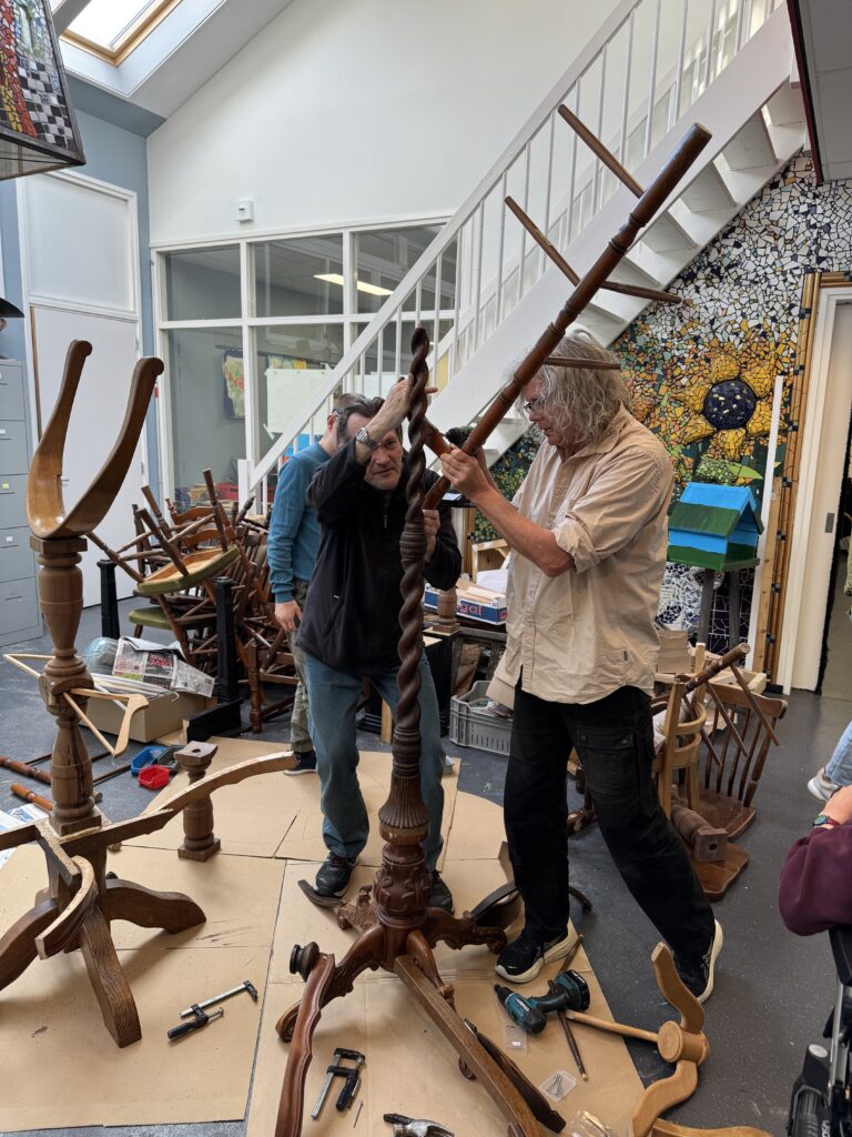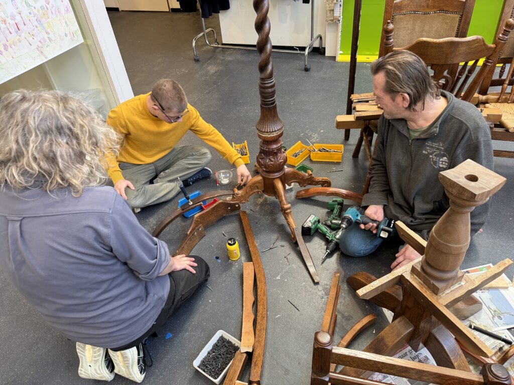In twee verschillende werkgroepen zijn we aan de slag gegaan begin dit jaar. De bijzondere bomen zijn bedacht en gemaakt samen met kunstenaar Machiel Braaksma. Wat een mooie, waardevolle samenwerking was dit. Een kunstwerk bedenken bij het thema: ‘grun, waar kom je vandaan?’, is zo makkelijk nog niet.. Na 2 brainstormsessies kwamen we tot een prachtig idee: bomen maken van hergebruikt hout, met wortels van touw. Met dank aan kringloopbedrijf De Wissel, zijn er twee bomen uit oude meubelstukken ontstaan. En ook is er een boom van pallethout gemaakt. Hierin zijn voorwerpen gehangen waarmee de medewerkers hun verhaal vertellen waar ze vandaan komen. Op de tekst labels lees je hun verhaal.