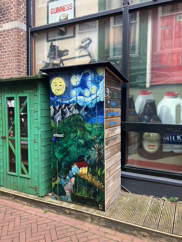 In opdracht van het binnenstadmanagement hebben twee van onze medewerkers een tuingereedschappen-kast beschilderd. Wat voorheen een saaie houten kast was, is nu een pronkstuk in de Nieuwe Oosterstraat!